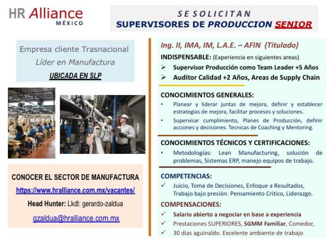 Con experiencia comprobada en el giro y la industria, estudios profesionales y de especialización o postgrado.